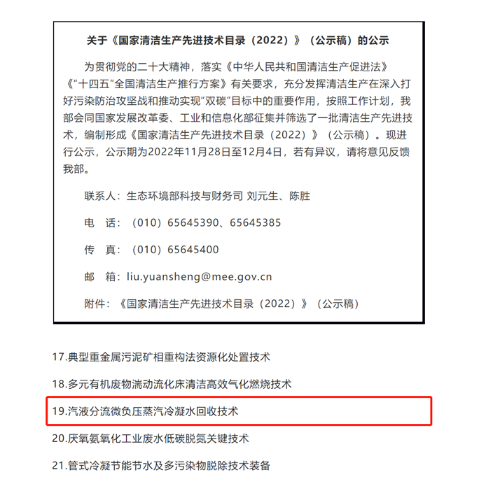 喜報| 我司汽液分流微負壓蒸汽冷凝水回收技術成功入選《國家清潔生產先進技術目錄(2022)》