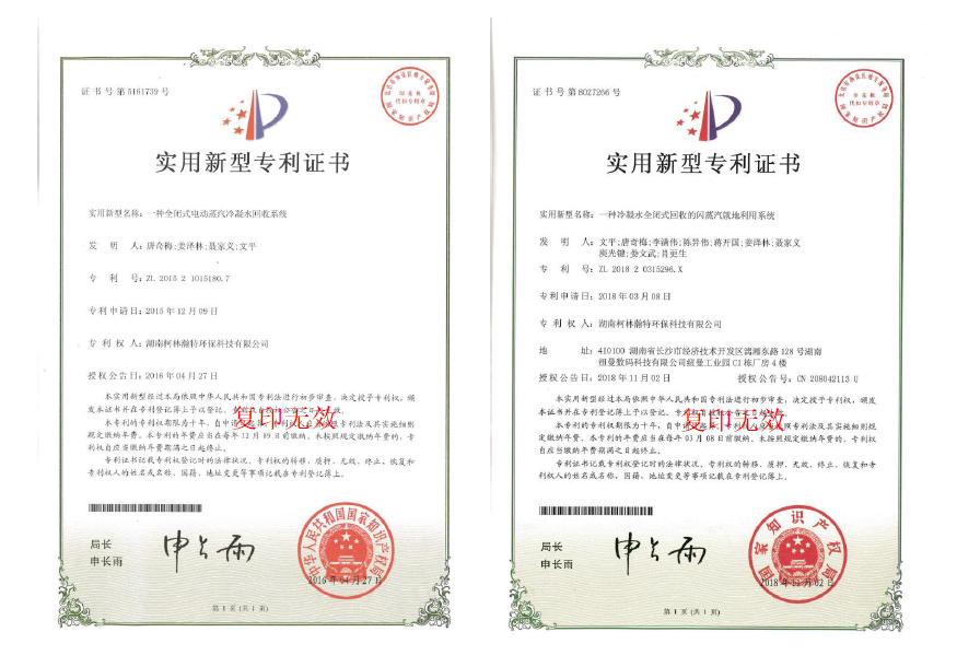 該技術已獲得國家發明專利1項,實用新型專利3項,軟件著作權1項。另外,公司牽頭制定了湖南省地方標準《蒸汽冷凝水回收設備通用技術條件》及綠色設計產品團體標準《綠色設計產品評價技術規范 鍋爐余熱回收利用設備》。