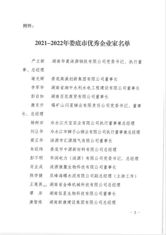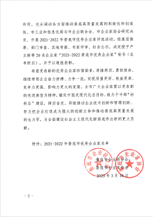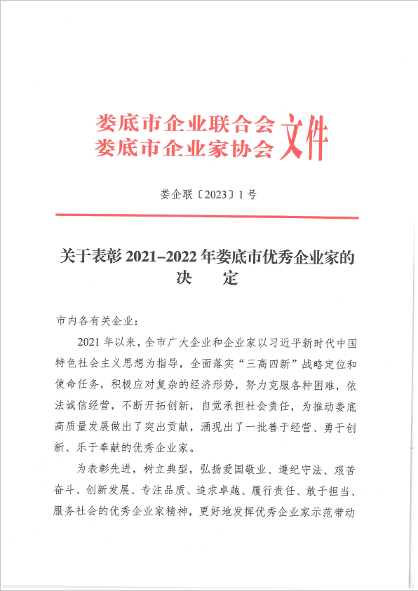 關于表彰2021-2022年婁底市優秀企業家的決定