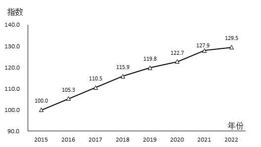 從測算結果看,以2015年為基期,2022年長三角區域發展指數為129.5,比上年提高1.6,與2015年相比,年均提高4.2。六個分領域指數均有所上升。其中,創新共建、綠色共保分項指數上升最快,年均提高超7.0;示范引領、協調共進和民生共享分項指數平穩提升,年均提高約4.0;開放共贏分項指數在波動中提高,年均提高1.0。