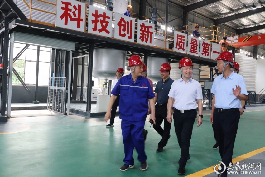 (湖南永澤冶金爐料有限公司、湖南永晟福新材料科技有限公司硅鋼表面涂層液項目竣工投產儀式后,李彥文一行參觀項目生產車間)