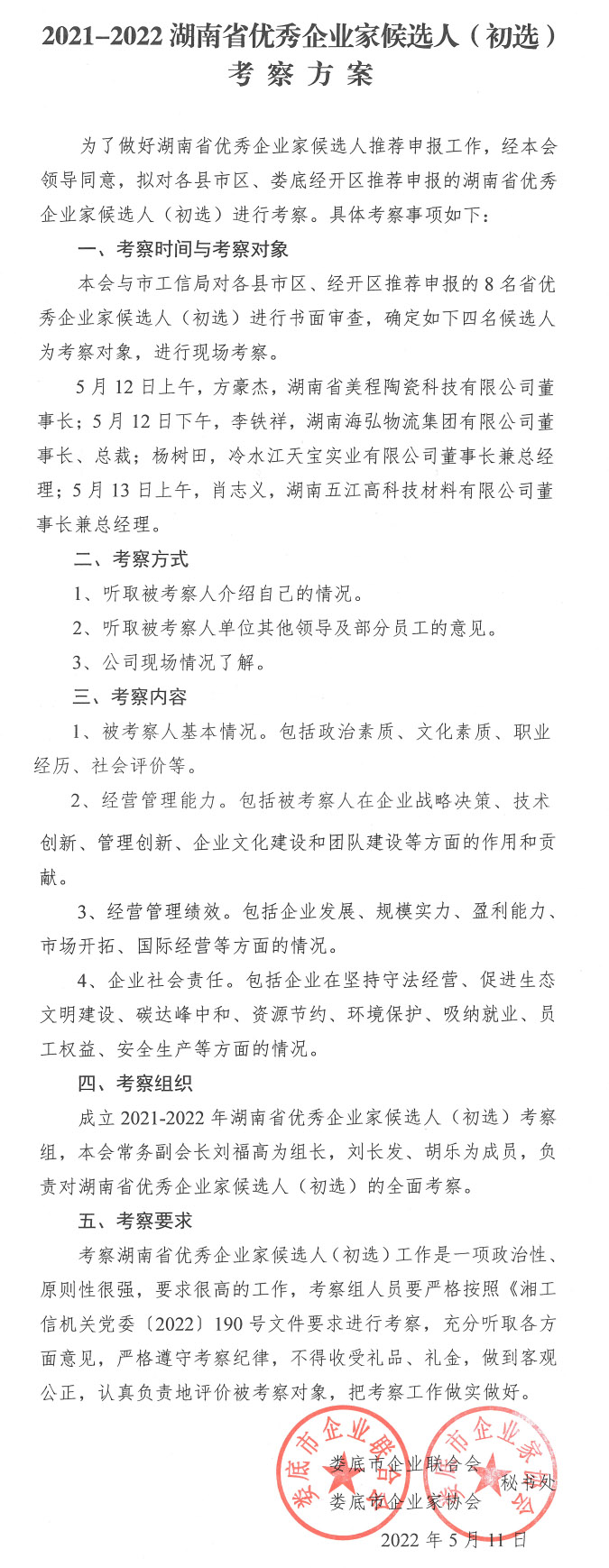 2021-2022湖南省優秀企業家候選人(初選)考察方案