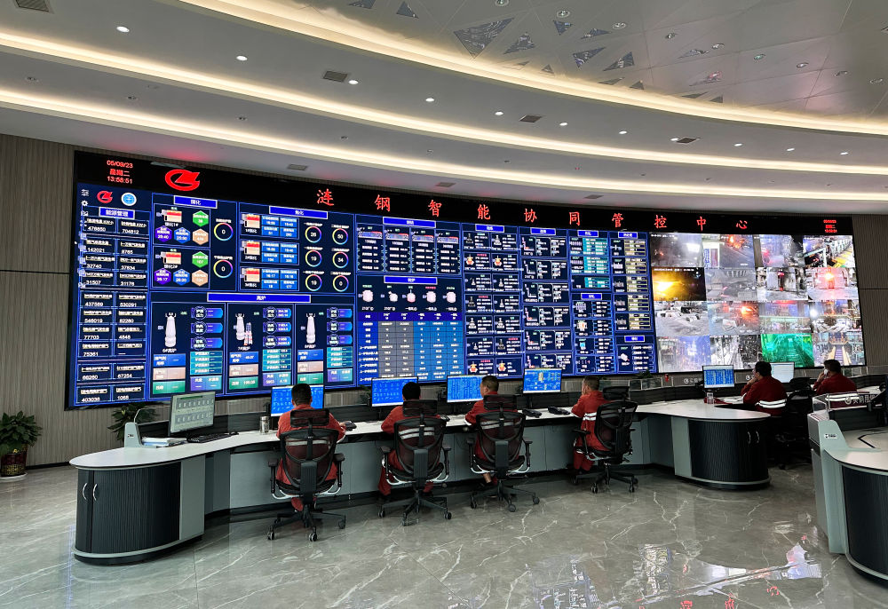 在漣鋼智能協同管控中心,LED屏幕上躍動著煉鋼環節的各項數據參數和生產一線的實時畫面,技術工人正在監測分析生產動態信息。