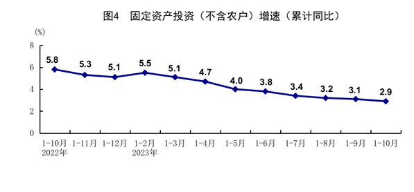 1-10月份,全國固定資產投資(不含農戶)419409億元,同比增長2.9%,比1-9月份回落0.2個百分點。分領域看,基礎設施投資同比增長5.9%,制造業投資增長6.2%,房地產開發投資下降9.3%。全國商品房銷售面積92579萬平方米,同比下降7.8%;商品房銷售額97161億元,下降4.9%。分產業看,第一產業投資同比下降1.3%,第二產業投資增長9.0%,第三產業投資增長0.4%。民間投資下降0.5%,降幅比1-9月份收窄0.1個百分點;扣除房地產開發投資,民間投資同比增長9.1%。高技術產業投資同比增長11.1%,其中高技術制造業和高技術服務業投資分別增長11.3%、10.5%。高技術制造業中,航空、航天器及設備制造業,醫療儀器設備及儀器儀表制造業投資分別增長19.0%、16.7%;高技術服務業中,科技成果轉化服務業、專業技術服務業投資分別增長37.3%、29.1%。10月份,固定資產投資(不含農戶)環比增長0.10%。
