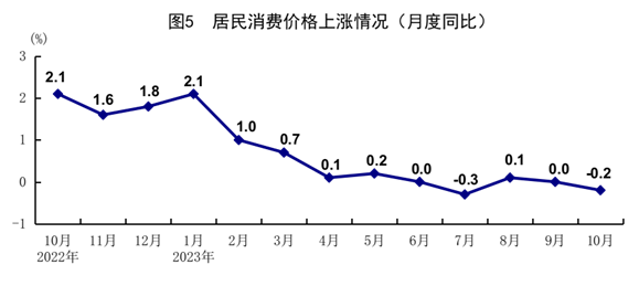 10月份,全國居民消費價格(CPI)同比下降0.2%,環比下降0.1%。分類別看,食品煙酒價格同比下降2.1%,衣著價格上漲1.1%,居住價格上漲0.3%,生活用品及服務價格下降0.6%,交通通信價格下降0.9%,教育文化娛樂價格上漲2.3%,醫療保健價格上漲1.3%,其他用品及服務價格上漲3.6%。在食品煙酒價格中,豬肉價格下降30.1%,鮮菜價格下降3.8%,糧食價格上漲0.6%,鮮果價格上漲2.2%。扣除食品和能源價格后的核心CPI同比上漲0.6%。1-10月份,全國居民消費價格同比上漲0.4%。